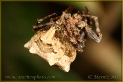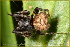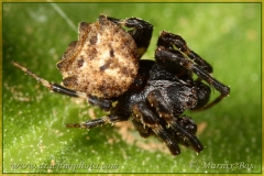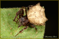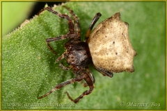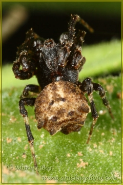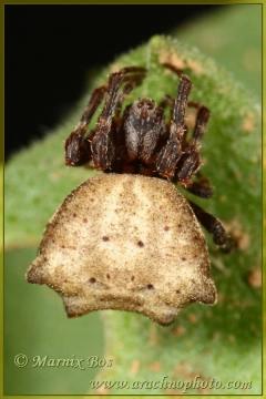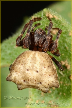 Abdomen opvallend breed en met zes karakteristieke knobbels aan de rand. Kleur lichtbeige tot bruinig.