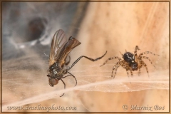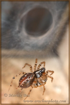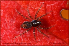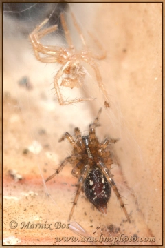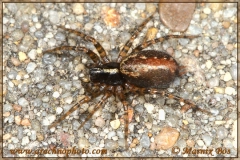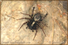 Abdomen black-brown with a white horseshoe-shaped pattern on the front and a yellowish or red median band at the rear, lined with white spots.
