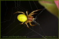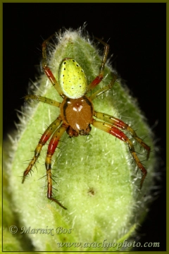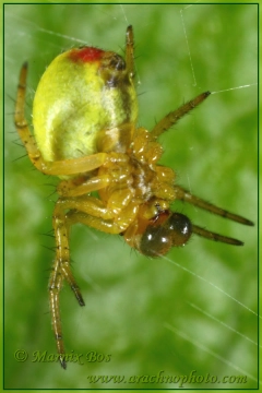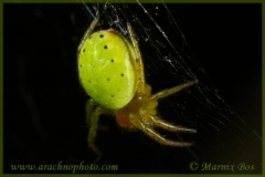 Abdomen yellow-green to green with two rows of four or five black dots and a bright red spot above the spinnerets.