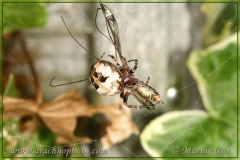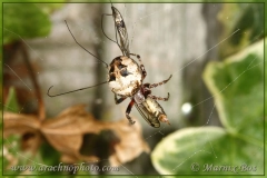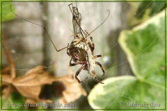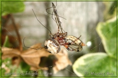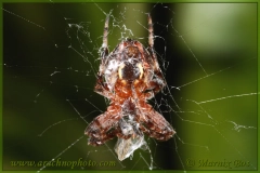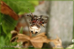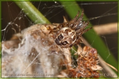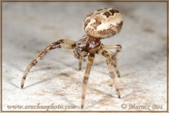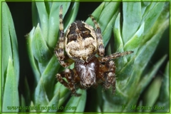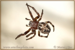 Abdomen ight brown, grey-brown or reddish brown with a light defined, dark leaf-shaped figure on top and a light defined triangular spot at the front. The bright outline is quite broad.