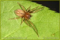 Abdomen lichtbruin met een donkerbruine hartvlek en schuine, donkerbruine streepjes aan de achterkant.
