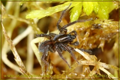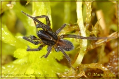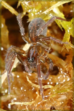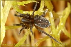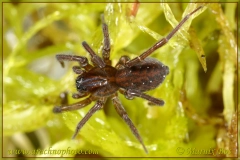 Abdomen dark brown with a light brown, dark outlined cardiac mark in a light brown median band that changes in chevrons and two rows of white spots towards the spinnerets. These spots are not always clearly present and sometimes lack completely.