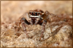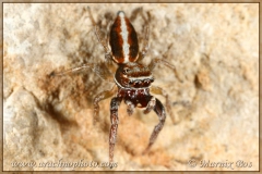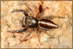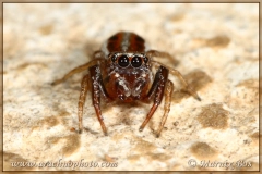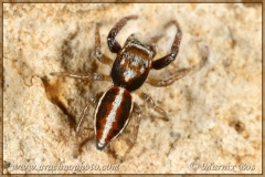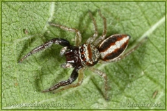 Carapace orange and white haired with a broad black band behind. Sometimes almost black on top. White band above the anterior eyes and a thin white band along the bottom edge. Chelicerae dark reddish brown.
