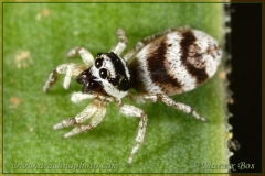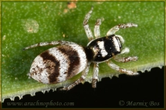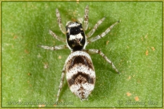Abdomen brown to black with two white cross bands and a white back with faint brown chevrons.