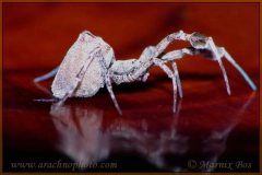 Legs creamy white to dark brown with a distinctive long tuft of hair on the tibiae of pair of legs I. In dark specimens the legs have white annulations.