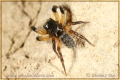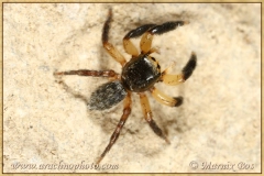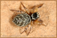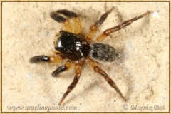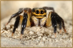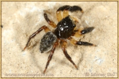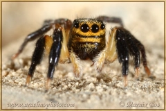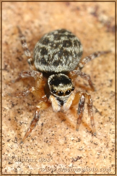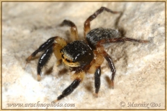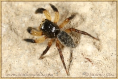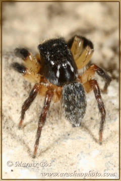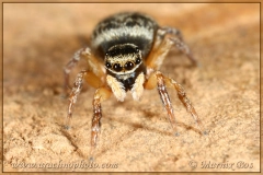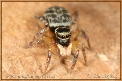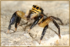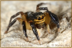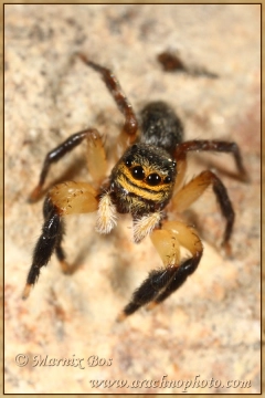 Carapax zwartbruin met een band onder de ogen die doorloopt tot bovenop het carapax. Gebied achter de voorste ogen en clypeus witgelig behaard en gele ringen rond de voorste ogen.