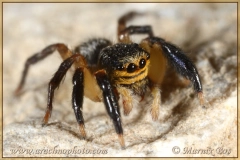 Carapax zwart met boven een tekening van witte en gele haartjes. Gezicht felgeel behaard met dunne, horizontale zwarte streepjes op de clypeus.