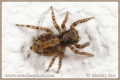 Carapax bruin tot zwart met een lichte middenband die naar de ogen toe steeds breder wordt en daar de hele bovenkant van de kop bedekt. Langs de zijkant en onder de voorste ogen lichte haren.