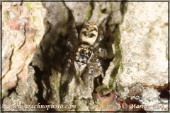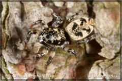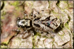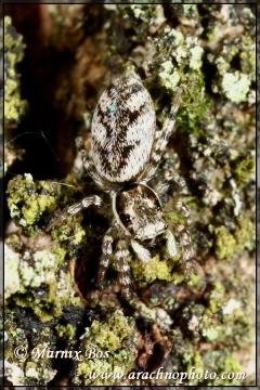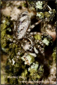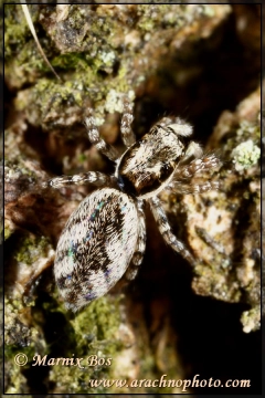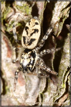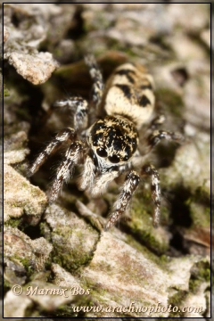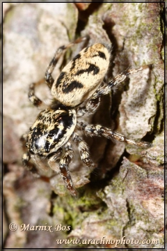 Carapax ongeveer gelijke tekening als bij Salticus scenicus, echter wel minder duidelijk en gebied rond voorste ogen wat minder wit behaard.