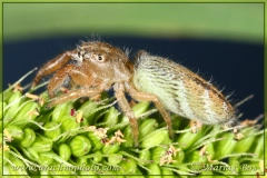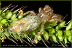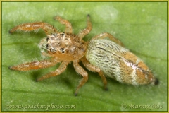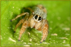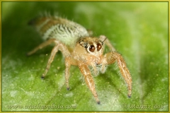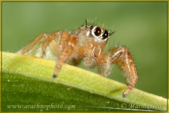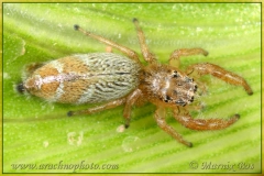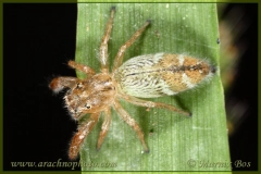 Carapax lichtbruin met een vaag patroon van witte en zwarte haartjes en zwarte vlekjes. Witte beharing rond de grote voorste ogen. Clypeus met lange witte haren. Aan de zijkanten plukjes lange zwarte haren. Sternum lichtbruin met een dunne zwarte omlijning.