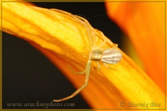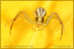 Carapax bleek gelig groen met bovenop twee donkere lengtebanden, een dunne witte lengteband in het midden en een dunne witte dwarsband aan de voorkant tussen de ogen.