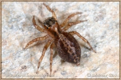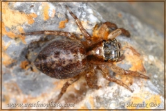 Abdomen dark brown with lighter spots along the sides and a lighter wavy median band with dark spots.