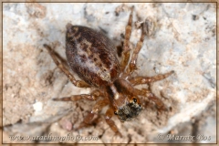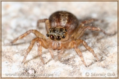 Carapace brown with two dark longitudinal stripes, a dark area near the eyes and a thin dark band along the edge. Eyes with yellow-orange rings.