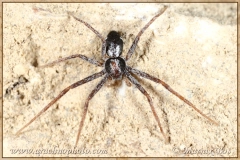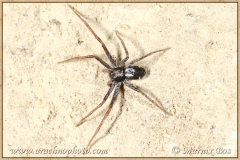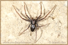 Abdomen black with two white spots at the back and a dark cardiac mark with a broad white outline.