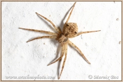 Abdomen pale brown to brown with two dark spots laterally on the broadest part, a small dark cardiac mark and faint chevrons behind it.