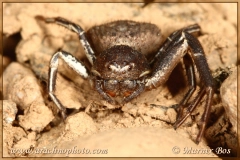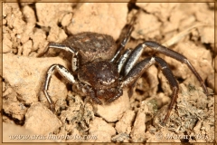 Legs dark brown with white spots on the femora and lighter underside. Pair of legs III and IV entirely covered with white stripes and spots.
