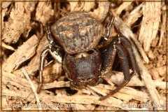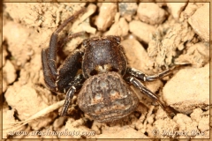 Carapace dark brown with small bumps and a light coloured field with two dark spots at the rear.
