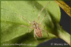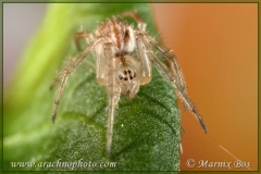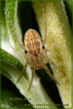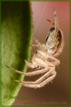 Carapax bleek met een oranjebruine middenband en donkere radiale strepen. Verspreid wat witte haren.