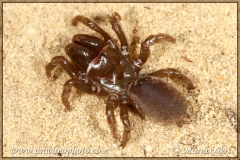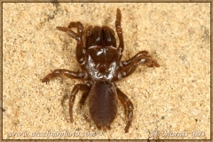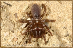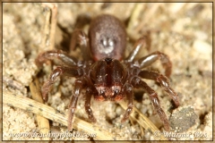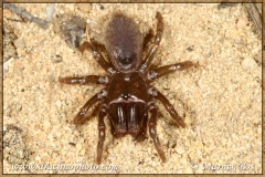 Carapax aan de voorkant verhoogd en verbreed met zeer grote, verticaal bewegende cheliceren. Kleur donkerbruin.