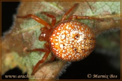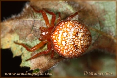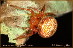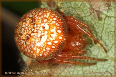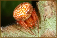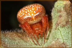 Abdomen light orange to orange-red with a pattern of white-yellow dots, and four slightly larger dots at the front.
