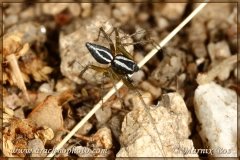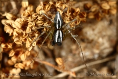 Carapace black with two broad white longitudinal bands which start from the upper eyes and converge to each other up to almost the back.