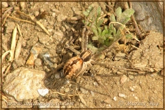 Carapace dark brown with two thin, light brown bands on top and a light brown border along the sides. Between the upper eyes some light brown hairs.