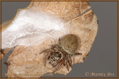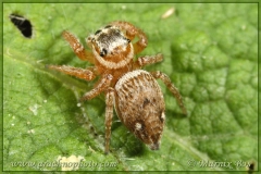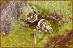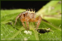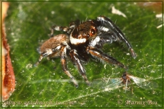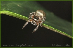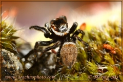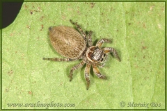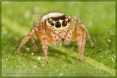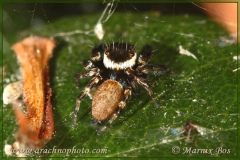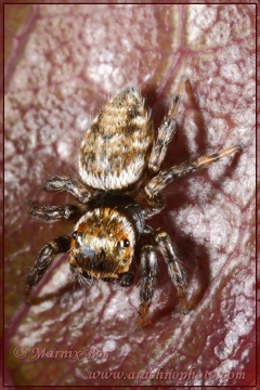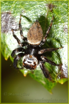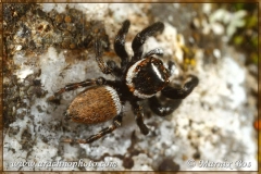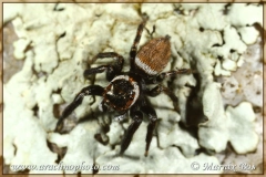 Carapace light brown to orange-brown with a distinctive white semicircular band around the side and back. On top darker hairs and surrounding the anterior eyes yellow with dark stripes along the sides.