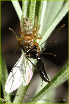 Abdomen rusty brown with a white band on top and sometimes a faint pattern of white hairs.