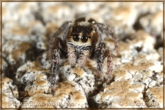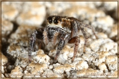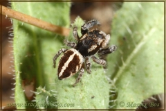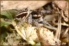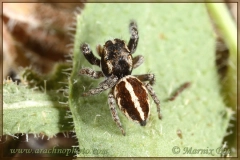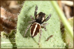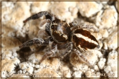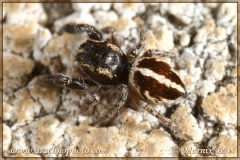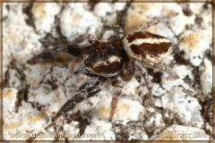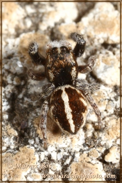 Carapace dark brown with two white bands running from the anterior lateral eyes to the rear and a white band along the edge. Around the anterior eyes light hairs and underneath some thin white stripes.