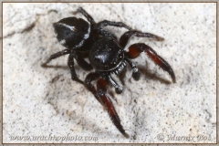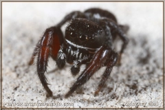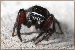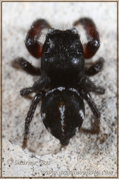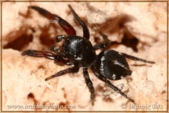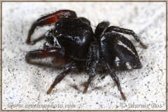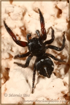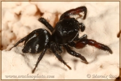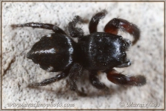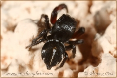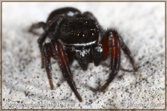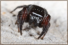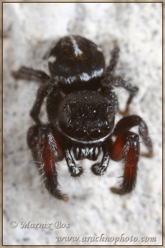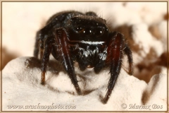 Carapace black with white spots behind the posterior eyes and two thin white bands around. Sometimes a vertical white stripe on top between the eyes. Chelicerae black with vertical white stripes.