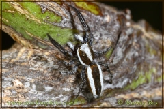 Abdomen dark brown to black with broad white longitudinal stripes.