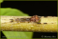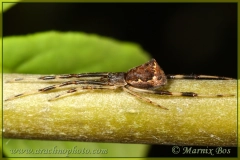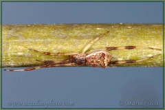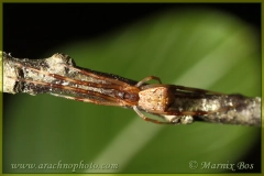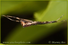 Abdomen remarkably triangular shaped. In larger specimens the corners end in tubercles. Colour yellow brown to reddish brown with a dark leaf-shaped figure on top.