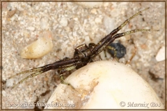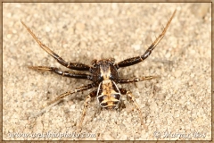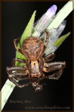 Legs yellow-brown with black-brown spots. First two pairs of legs from the top to halfway the tibiae black-brown with yellow annulations and thickened. Yellow-brown below.