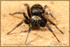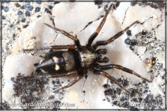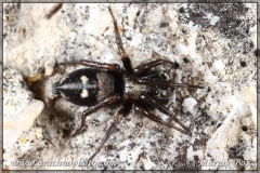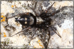 Abdomen zwart met een goud- of zilverglanzende vlek aan de voorkant, twee lichte vlekken bovenop en voor de spintepels.