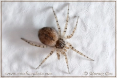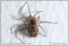 Abdomen licht geelbruin tot bruin met een donkerbruine band langs de voorkant en een patroon van donkerbruine en bleke vlekjes bovenop.