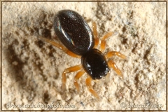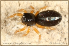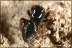Nagenoeg identiek getekend en gekleurd als het vrouwtje. Poten echter helemaal zwart met geelbruine tarsi. Abdomen met glanzend scutum.