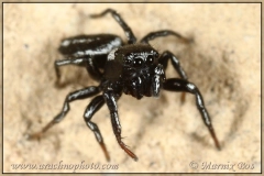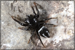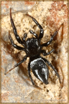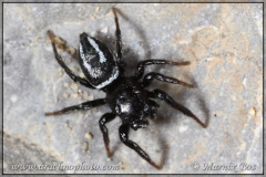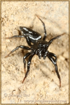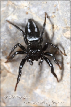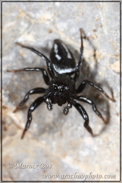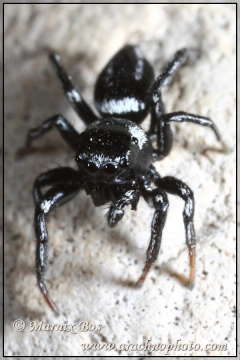 Carapax zwart met witte beharing rond de ogen en de zijkanten.
