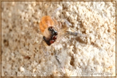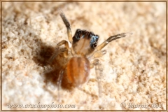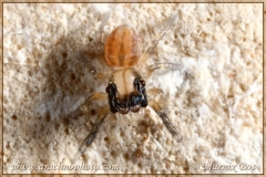 Nagenoeg identiek getekend en gekleurd als het vrouwtje. Palpen donkerbruin tot zwart met lichtbeige femora en tarsi.