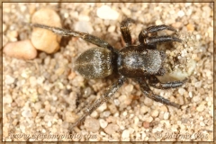 Carapax goudbruin tot zwart met twee witte banden bovenop en een witte rand langs de onderkant. Onder de voorste ogen witte haren.