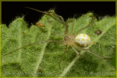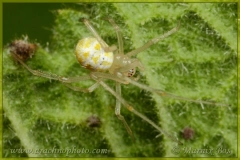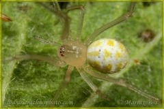 Vrouwtje 3 tot 4 mm. Tekening en kleur variabel. De spin is soms helemaal geel of wit.
