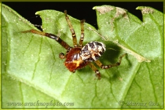 Poten en palpen geelbruin tot roodbruin met kleine donkere vlekjes en ringetjes. Voorste twee pootparen vaak wat donkerder dan de rest.