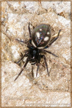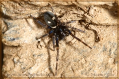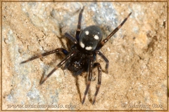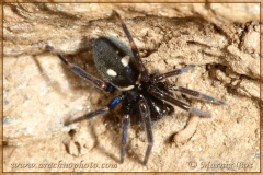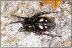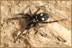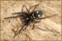 Abdomen zwartbruin met een in (zon)licht duidelijke metaalglans, twee witte vlekken aan de voorkant en twee tot drie witte stippenparen bovenop.